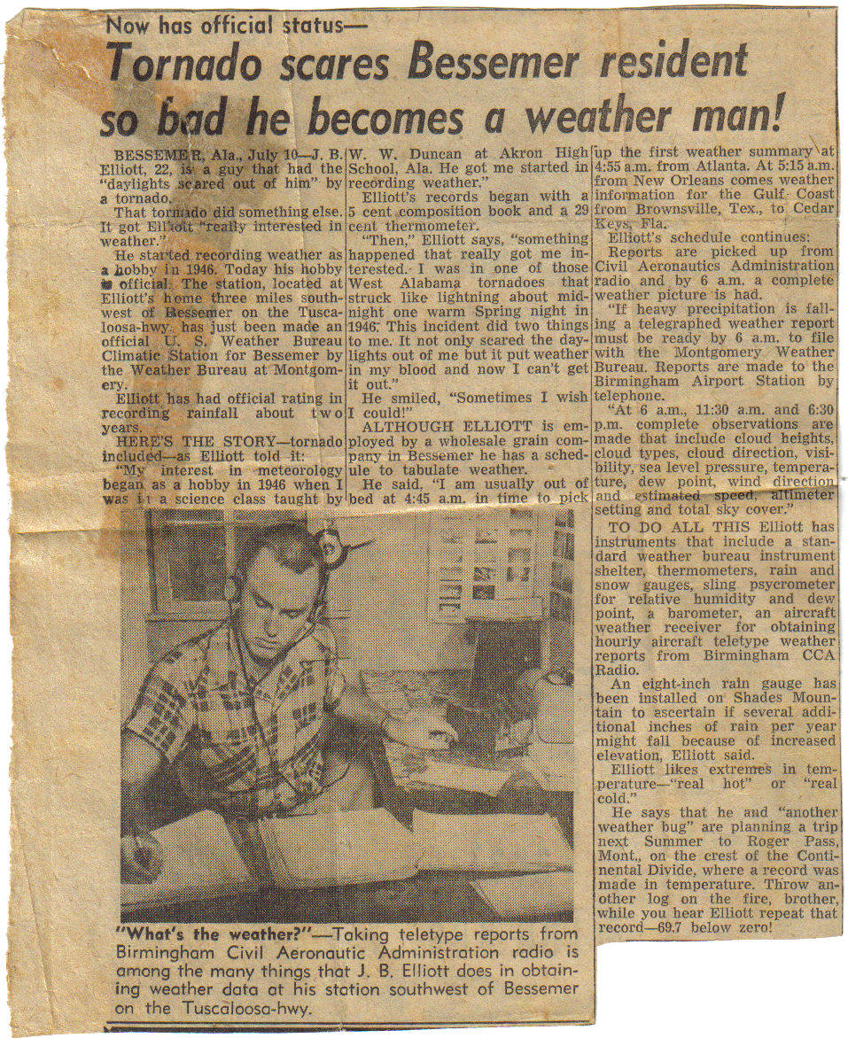 Who Is That Dashing Young Man?: Our crack staff of researchers (actually Larry McCray from Alabama) has uncovered a rare 1954 article about the great weather legend, JB Elliott. JB has had weather in his blood since an early age. Click here or the thumbnail to read the article. Here is a more recent picture of JB.